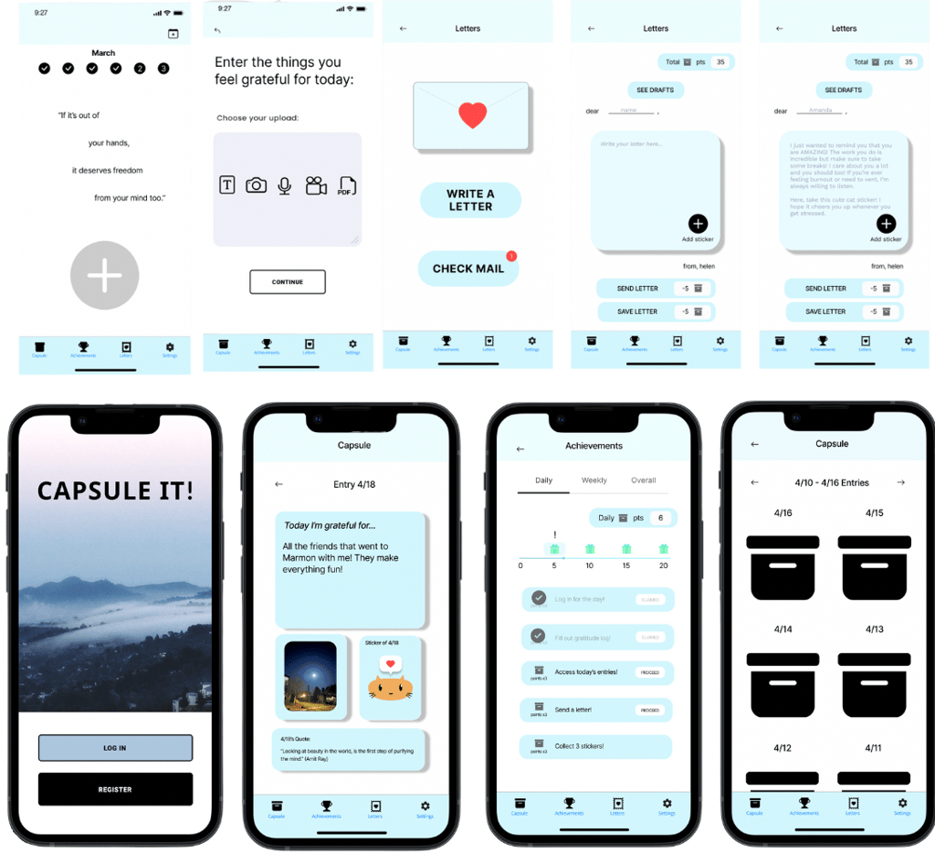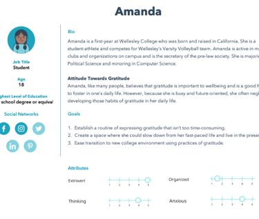 In order to help navigate through the stressful, unfamiliar process of transitioning into the first year of college, our prototype will focus on providing first-year students with a space to slow down, live in the present moment and use gratitude to help ease their transition. To view a demo click here!