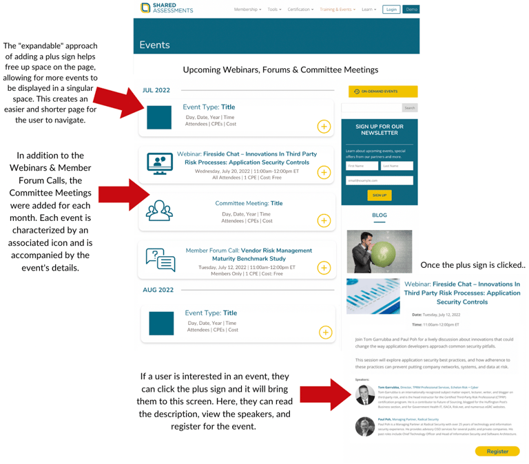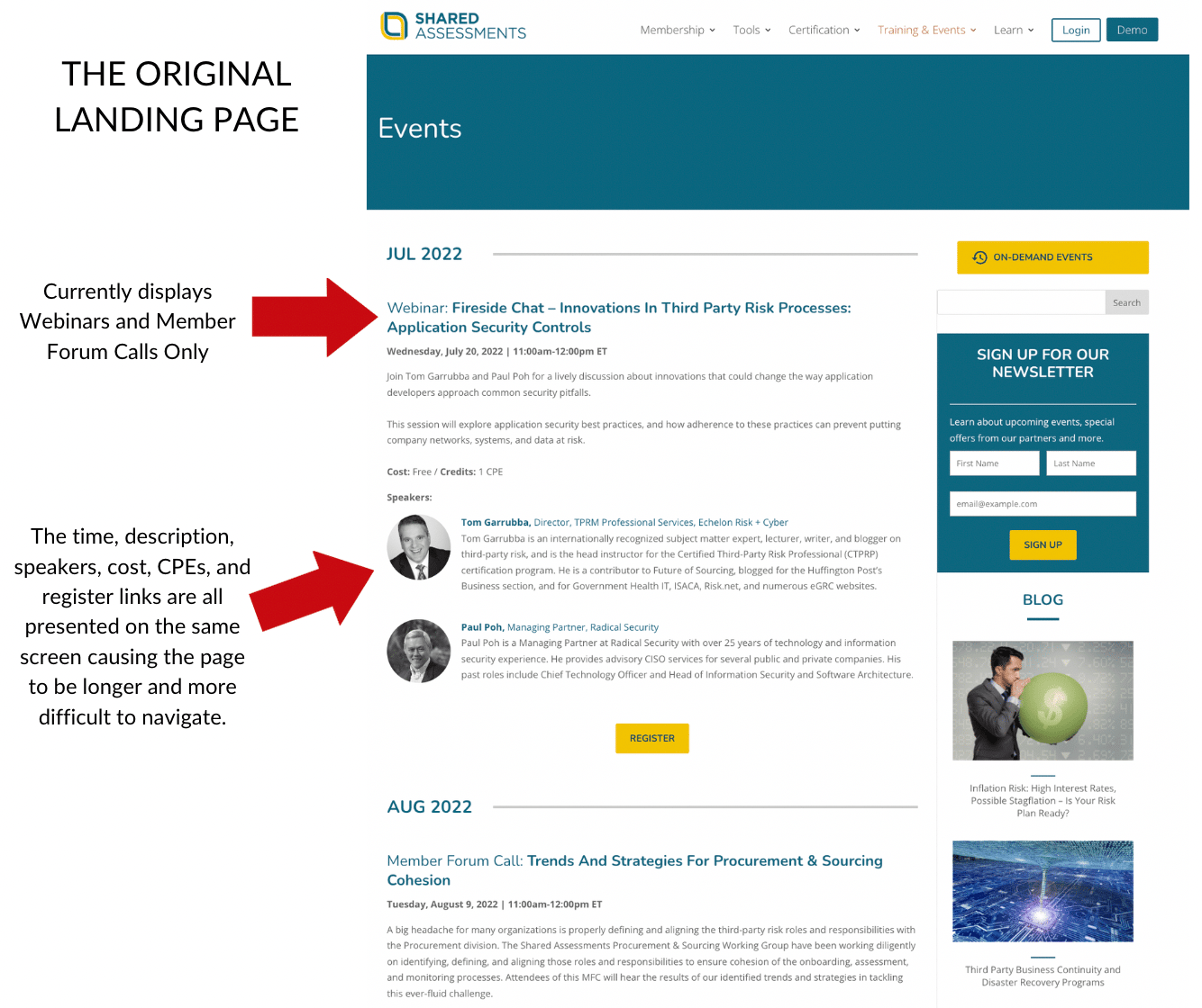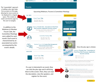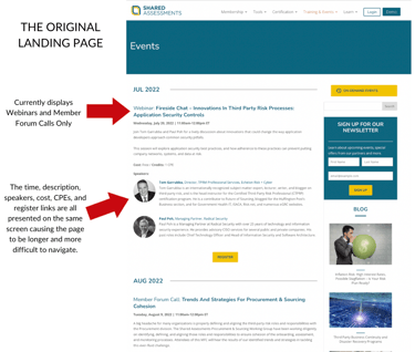The goal of this redesign is to simplify and expand the Shared Assessments' Events landing page to display three types of events: Webinars, Member Forum Calls and Committee Meetings. Each event will include the event type, title, date, time, cost, and CPE credits.