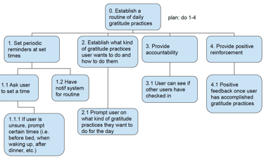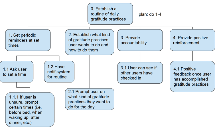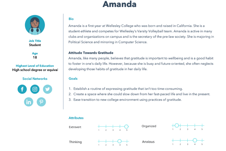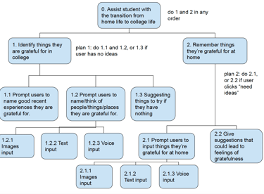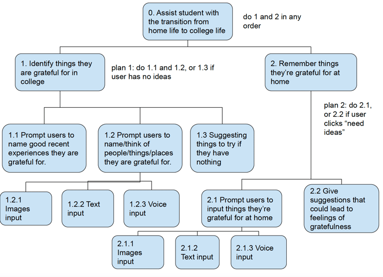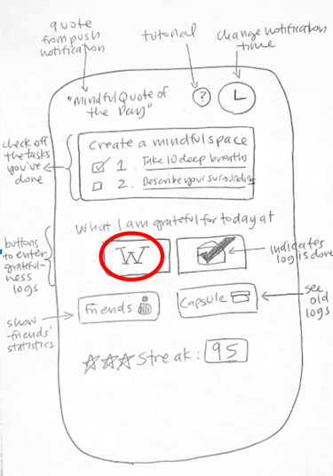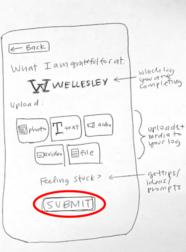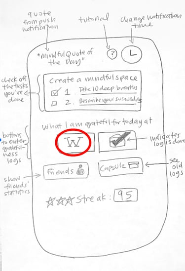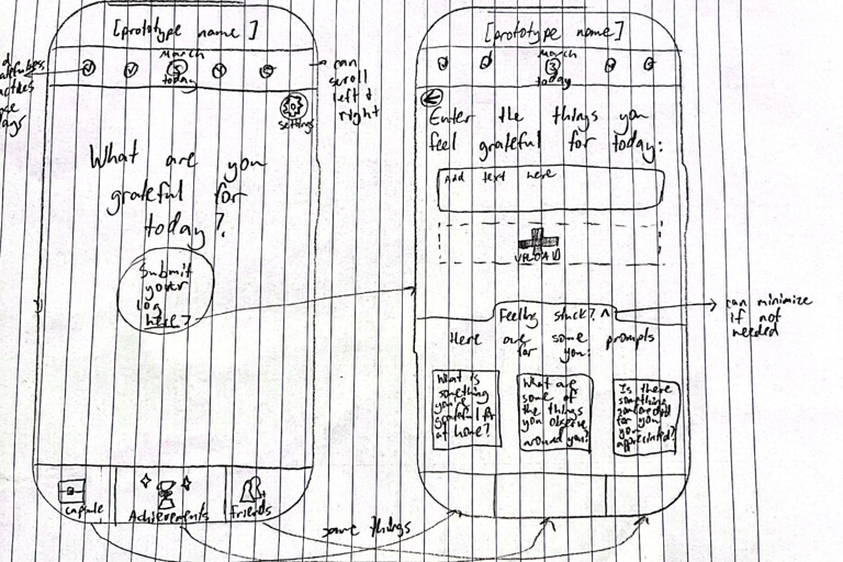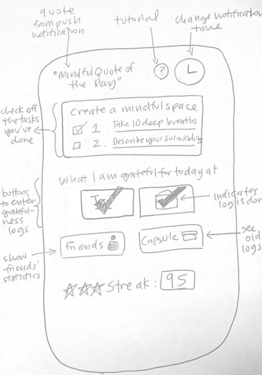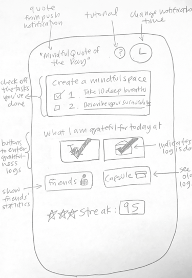 In the transition to college, first-years are moving into a very future-oriented environment where they are conditioned to worry about their future classes, major, career trajectory, etc. As a result, they often have trouble living in the present and being grateful for what they have both in their previous and in their current environment. In such an environment that is often far from their homes, they often feel stressed or homesick. In order to help navigate through the stressful, unfamiliar process of transitioning into the first year of college, our prototype will focus on providing first-year students with a space to slow down, live in the present moment and practice gratitude to help ease their transition.